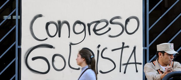Mulher passa em frente a pichação contra o novo presidente do Paraguai, Federico Franco, nesta terça-feira (26) em Assunção.O presidente destituído do Paraguai, Fernando Lugo, disse nesta terça-feira (26) que desistiu de participar, na próxima sexta, da Cúpula do Mercosul da qual o Paraguai foi excluído após seu impeachment.